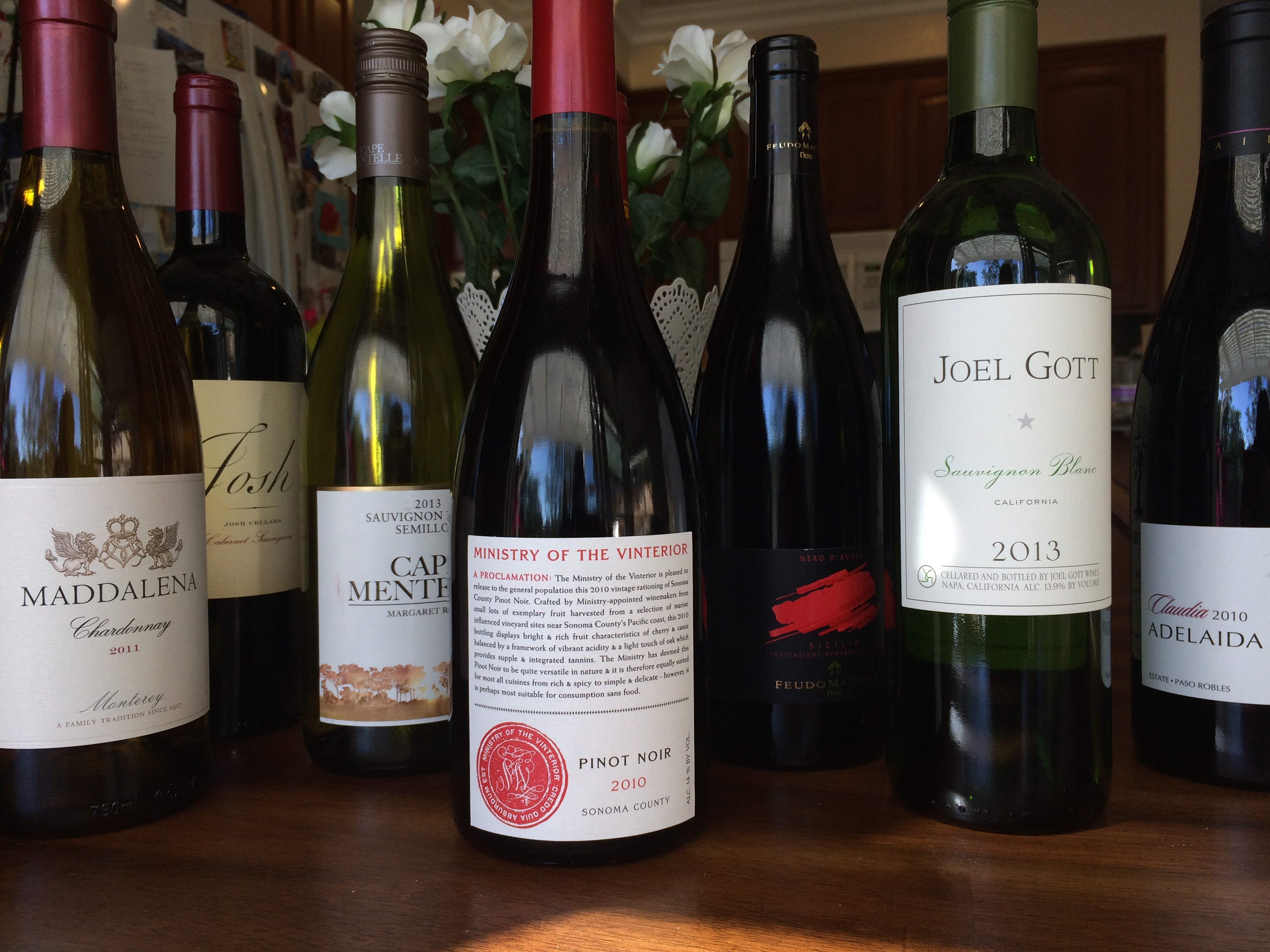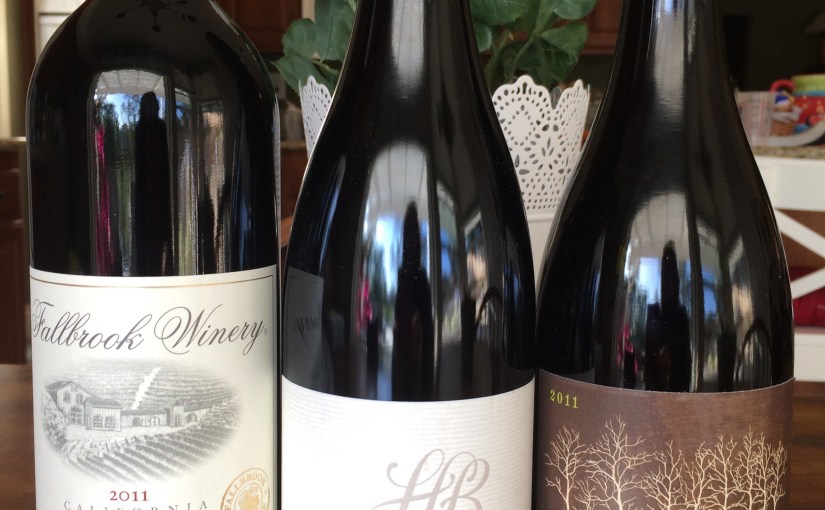 Among the most interesting bottles are Fallbrook Winery 2011 Cabernet, Hilliard Bruce 2009 Moon Pinot Noir, and Gros Ventre 2011 Pinot Noir. Multiple bottles of each, hot dog!