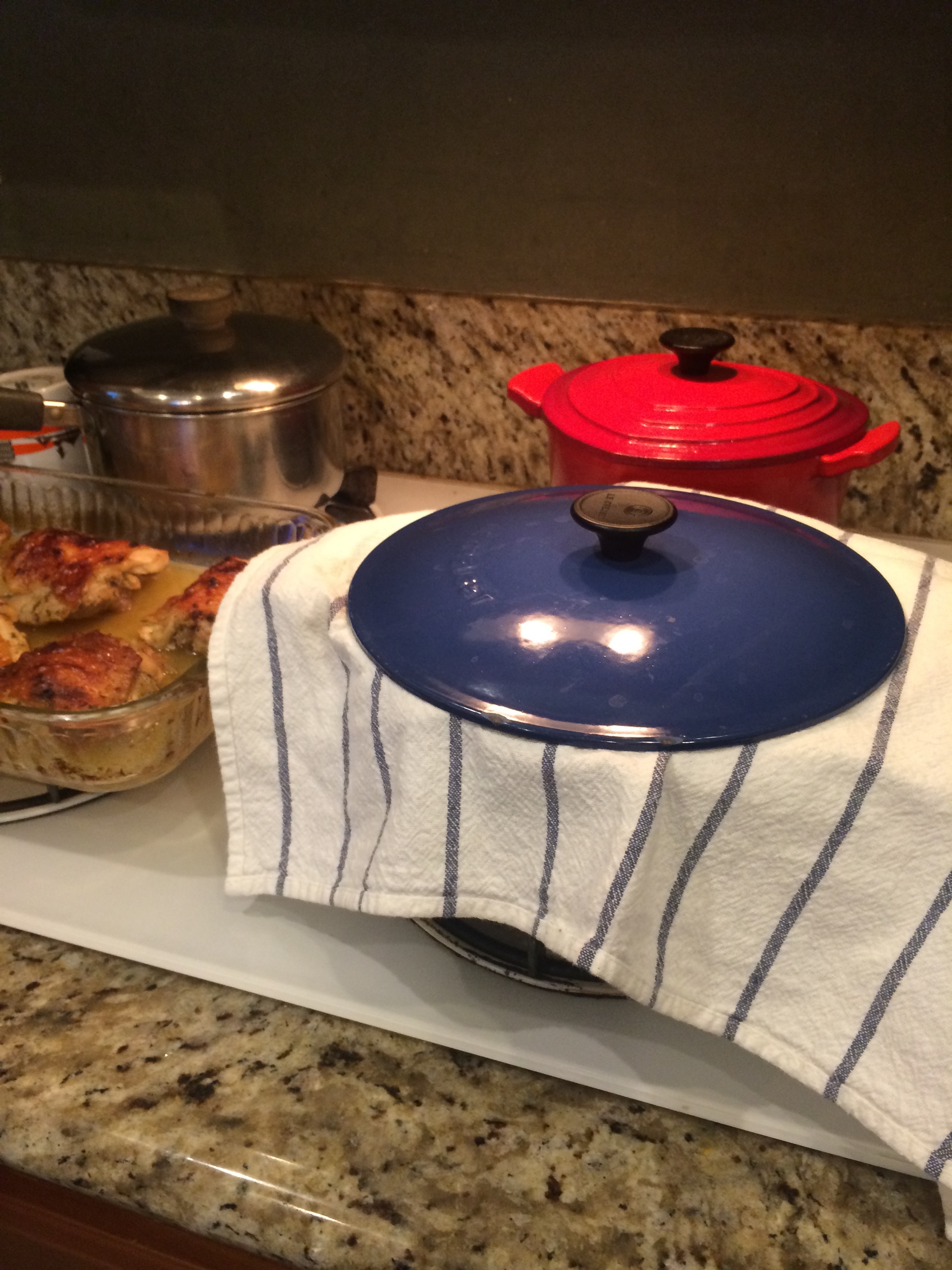 1- Place rice in a large bowl and rinse a few times to remove excess starch. Fill bowl with hot water an inch or two above the level of the rice and let it sit for about 15 minutes. I think my water wasn’t hot enough- on the TV show, it was steaming hot. This part helps to par cook the rice, and if the water isn’t hot enough, expect a longer cook time in the end…