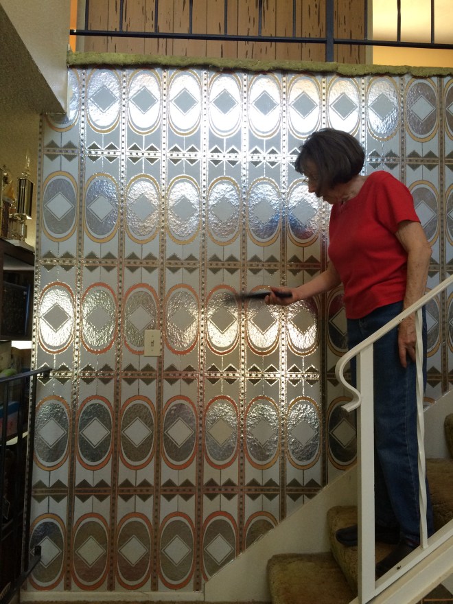Previous ImageNext Image IMG_6032 Mom models the best of two centuries with an iPhone in hand, in front of the vintage 1970’s wallpaper.