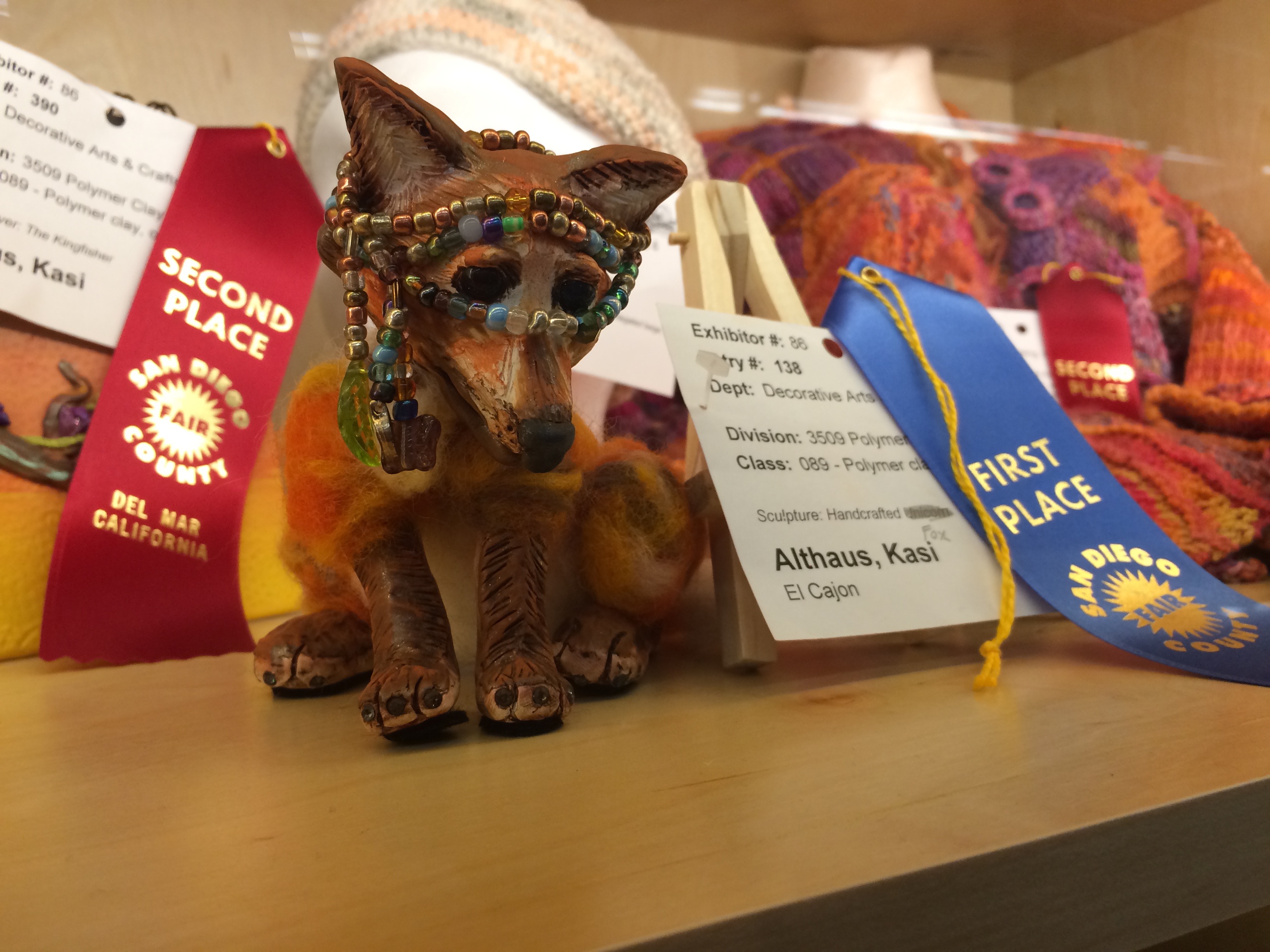 After the fur and lint display, we were losing it. Other oddities included this beautifully crafted fox… we couldn’t figure out why the beads? It made us want to demand that artists be allowed to include a note about the inspiration behind their pieces, just like the Collections are able to display.We loved the goofy shirt pillows, a great recycling idea.