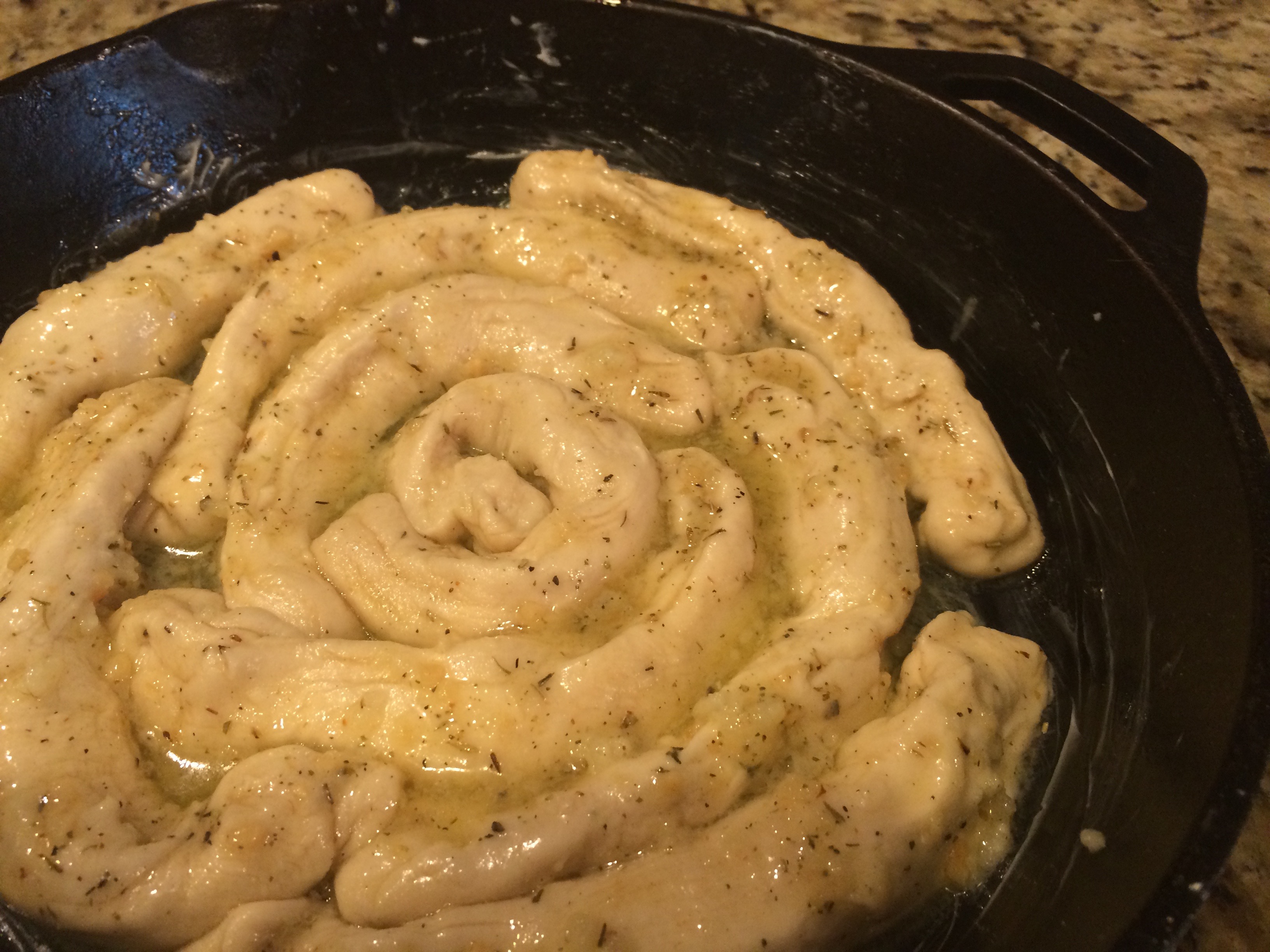 Microwave butter on a plate then mix in the cheese, garlic, and Italian seasonings. Roll thawed dough balls into ropes, then roll in seasoned butter and place coiled up in your buttered cast iron pan. Bake at 350 for 15-20 minutes or until golden brown on top.