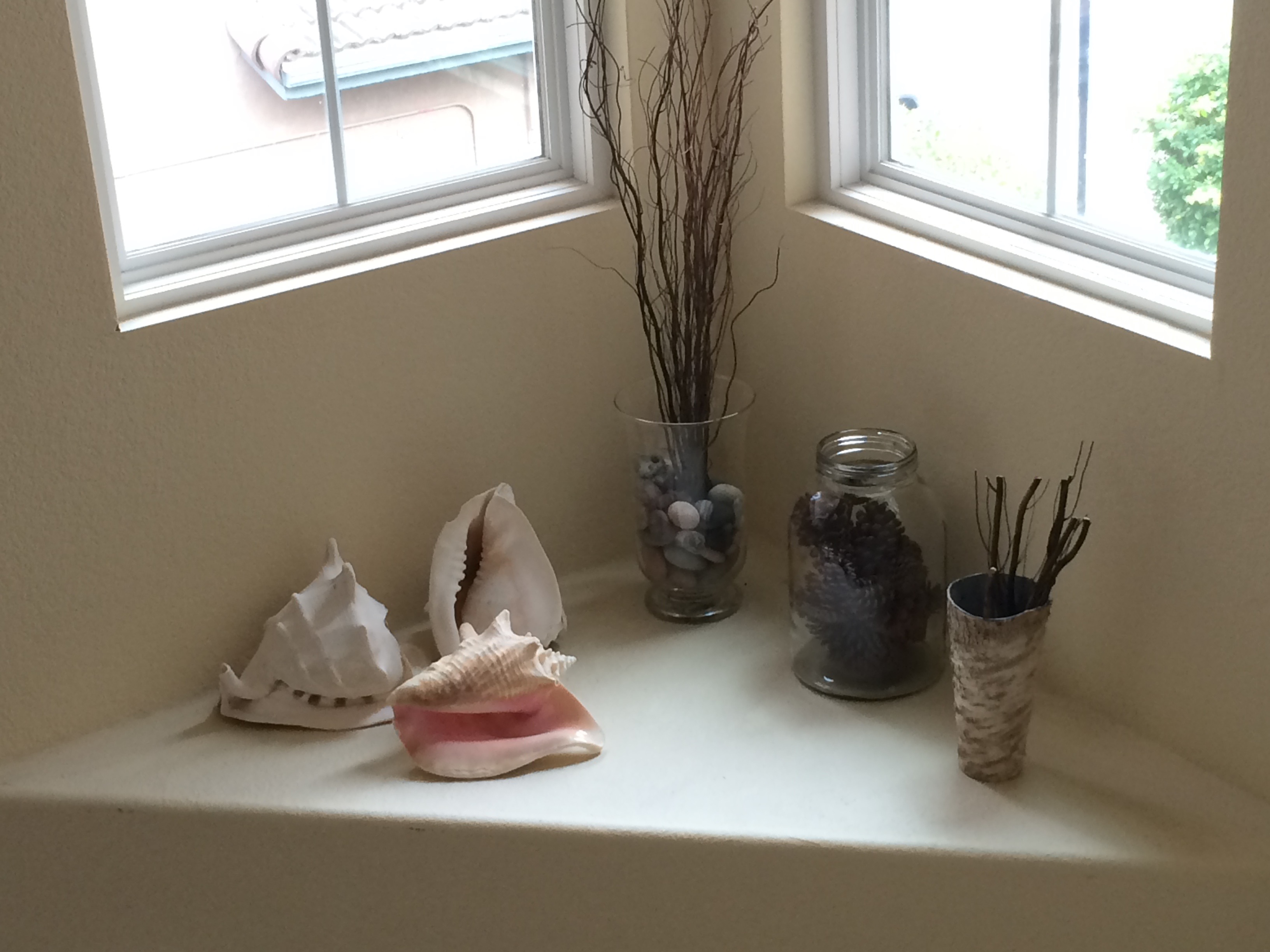 It took awhile but I finally gathered together items from our travels into a small collection to put into this awkward niche above my front door. Rocks from beach trips, conch shells from the great-grandparents’ world travels, pine cones The Boy has collected… only the tall sticks came from the craft store. So I cheated.
