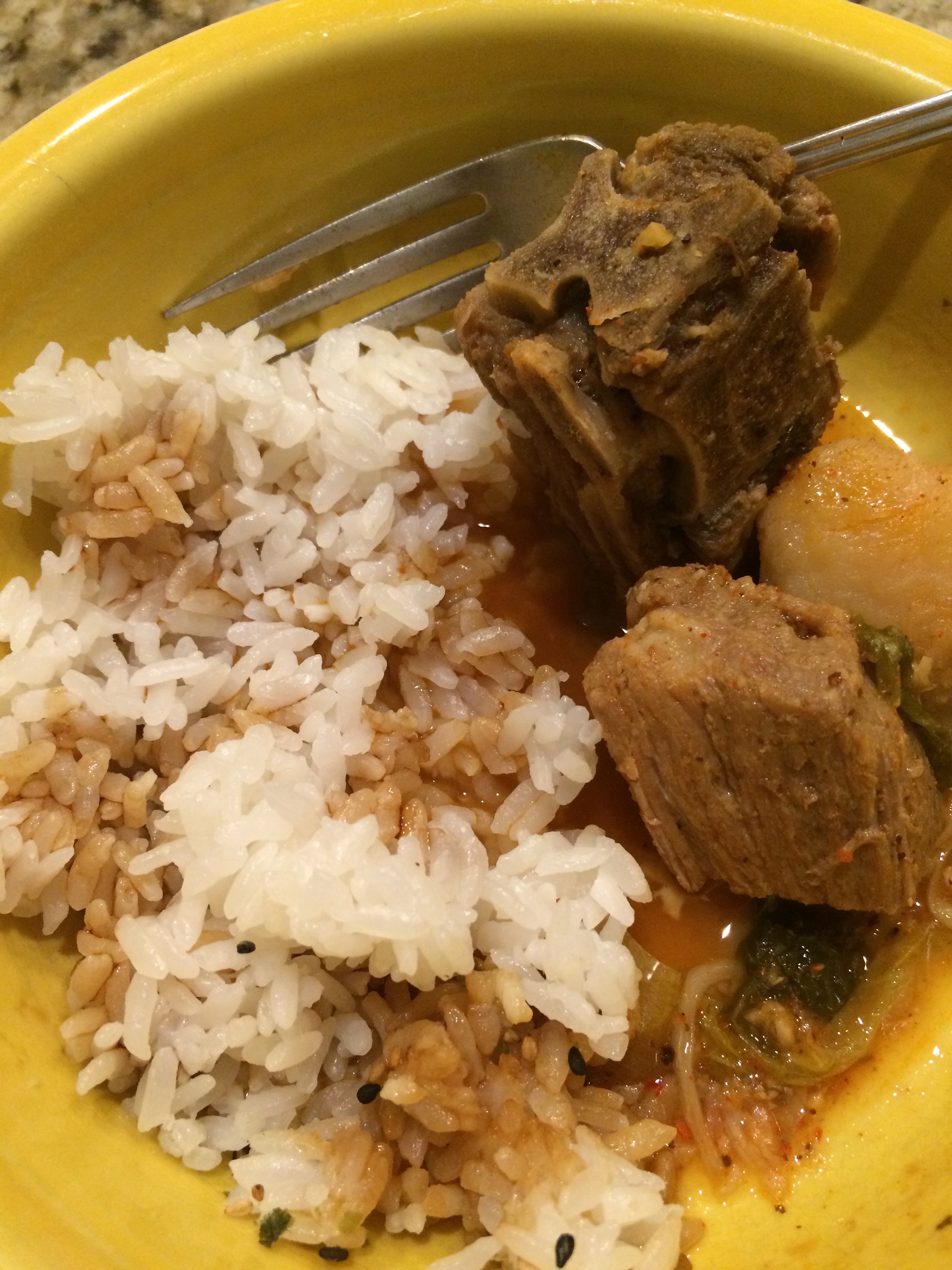 Between The Husband, International Guy and me, we all decided that it isn’t too bad. It’s not too great, either. I think it would be good choice if you had a cold- just enough spicy heat to help clear your head. The potatoes didn’t fare too well with the defrosting, as potatoes are wont to do. But, the broth had a decent flavor. The pork smelled great, but was stringy and dry. And it was more of a soup than a stew- no need to serve over a rice or noodle.